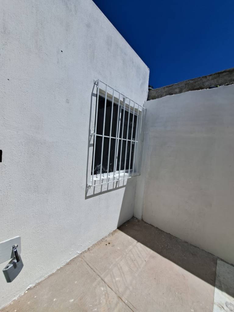 La casa tiene 2 cuartos y un baño completo, cocina, sala, comedor y un pequeño patio. Todas las ventanas tienen protección de metal y las puertas son nueva.